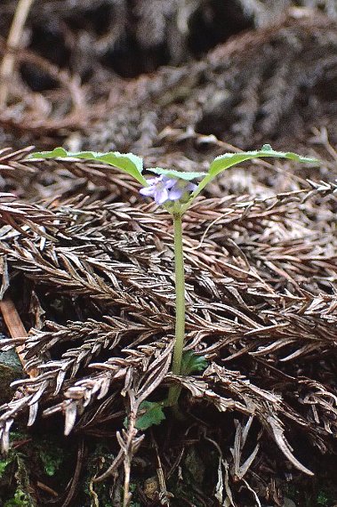 やや暗い杉林の斜面に生えていました。キランソウともキンモンソウとも違い、同定は保留していました。