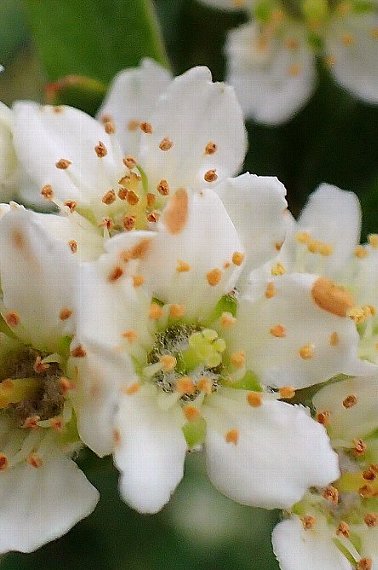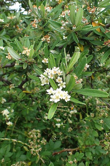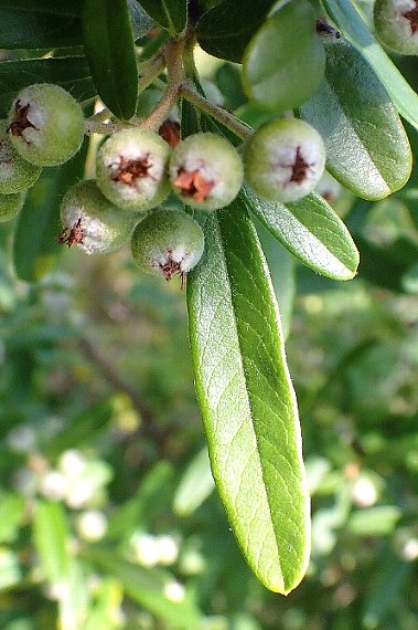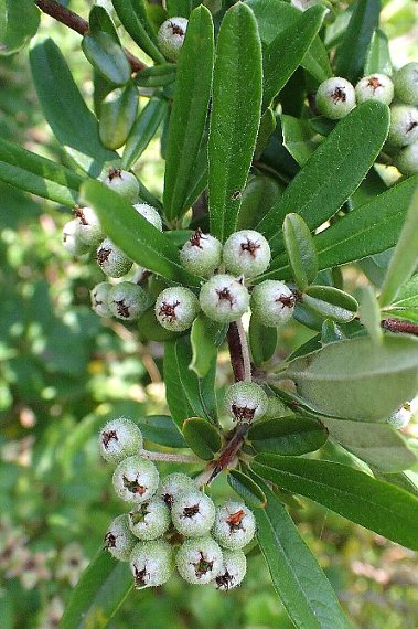 本種、カザンデマリ、トキワサンザシを総称してピラカンサと呼ばれますが、本種は葉の幅が細いこと、葉裏や萼などに白い綿毛が密生すること、果実は黄色味があることなどが特徴です。