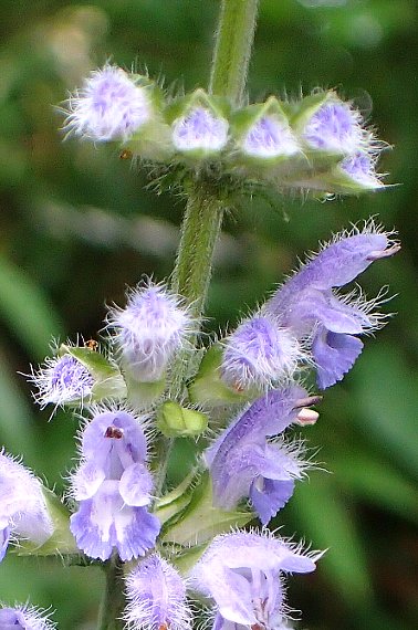 山野に生える多年草で、高さ20〜80センチ。葉は対生し、1〜2回羽状複葉、稀に単葉。小葉は3〜7枚で広卵形、縁には鋸歯がある。下部の葉には長柄がある。 茎の上部に長さ10〜25センチの花穂を出し、長さ1〜1.3センチの淡青紫色の唇形花を数段輪生する。花冠の外側には白い毛が多い。花期は7〜11月。本州〜沖縄県に分布する。 〜徒然想〜 すぐ下に民家が連なり、木を切るチェーンソーの音が響き渡ります。民家からみれば、ここは家の裏山にあたります。そんな所でも、コンクリートに囲まれた都会人には新鮮な場所です。裏山に続く道は陽当たりがよく、次々に山の花が現れます。 アキノタムラソウは、夏から秋口に山間を歩くとよく見られます。丘陵や海岸付近の草地でも見られることがあります。 雄しべが花冠より飛び出さないのが特徴で、対し、ミヤマタムラソウは明らかに飛び出します。 −同じ科の植物−