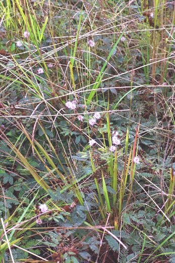 南アメリカ原産の多年草で、園芸的には1年草扱いにされている。茎はよく分枝し、長さ1メートルほどになる。葉は偶数2回羽状複葉からなる小葉が2〜4枚葉柄の先端に付く。 夜間や触れたりすると小葉が閉じて葉全体がやや垂れ下がる。 小さい紅紫色の花を、1センチほどの球状に付ける。 〜徒然想〜 さあ、これからリュウキュウツワブキやナガバハグマが咲く沢に下りようとした荒れ地に咲いていました。見つけたときに付けられた名前は“オジギソウの仲間”、まだ誰も名は分かりません。葉を突っついてみると葉は閉じ、確かにオジギソウの仲間です。 雨に濡れ、ボンボンのような花の形は崩れていますが、濃いめのピンクがきれいです。 図鑑などで調べてみると、これが正真正銘のオジギソウでした。 オジギソウの名は知っていて、触ると葉が閉じるのを喜んだ記憶があります。他愛ない、遙か昔の記憶です。 −同じ科の植物− |