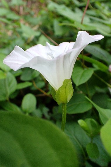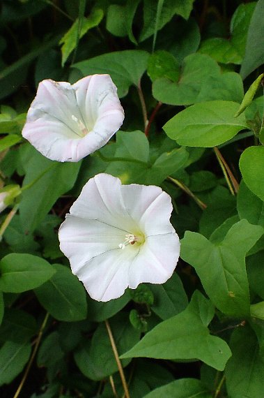 野原や道端に生える多年草で、他の植物などに巻きついてのびる。葉は葉柄があり、三角状ほこ形で、側裂片は浅く2裂する。 花冠は淡紅白色で、長さ3〜3.5センチ、直径3〜4センチ、花柄は長さ2〜5センチ。花柄の上部には縮れた狭い翼がある。花期は6〜8月。本州以南に分布する。 〜徒然想〜 12月ともなると関東近辺の山にはほとんど花がなくなり、寂しい想いになります。 そんなときでも、陽射しのあるときは近くの河原などに出かけます。あてはありません。 いつもよりなお一層ゆったりと歩を進めると、思いがけない花に出逢えることがあります。このコヒルガオもその一つでした。花期はふつう6〜8月ですが、陽当たりのいい河原に1輪だけ花開いていました。 早春に咲くホトケノザも冬場に返り咲くことが多いです。 ヒルガオとコヒルガオ、その交雑種といわれるアイノコヒルガオの違いを調べてみました。 コヒルガオは、花が小さめで五角形、苞はやや短く先端が尖る、花柄には波打った明確な翼があるなどが特徴です。 −同じ科の植物− |