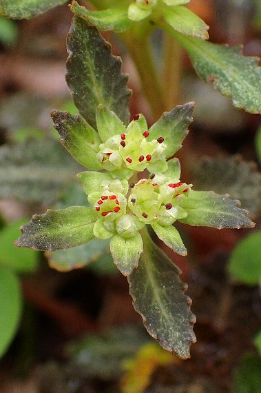ヨゴレネコノメと同じくイワボタンを母種とする高さ5〜15センチの多年草。ふつう根出葉は花時にはなく、花後に30センチにも達する走出枝を出す。 萼片は淡黄色で花期にはほぼ平開し、雄しべは8個。開裂直前の葯は暗紅紫色。花期は4〜5月。東北地方南部〜中部地方の太平洋側に分布する。 〜徒然想〜 ヨゴレネコノメとの違いがよく分からなくて、アップを先延ばしにしていました。図鑑などには、萼片が平開する、葯が4〜8個で暗紅紫色などの特徴が示されています。 しかし、萼片がまだ平開しきれていない初期のものがあったりすると、即、迷いになってしまいます。 少し救われつつあるのは、数を見ることによって、典型的なものと、そうでないものとを見分ける目が、多少なりとも出来てきたことでしょうか。植物によって、見なければならない部分が分かってきたことでしょうか。 違いは、ヨゴレネコノメの萼片はほぼ直立し、葯は暗紅色、花糸、花柱及び子房が紅紫色を帯びることを、指標にしています。 母種のイワボタンの葯は黄色です。 −同じ科の植物− |