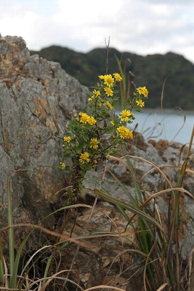 別名アブラギク。日当たりのよい山野に生える多年草で、高さは30〜80センチ。茎の下部は倒れ、上部は立ち上がる。葉は3〜5中裂し、基部は切形〜くさび形、裏面には丁字状毛があり淡緑色。 頭花は黄色で直径1.5〜3センチと幅がある。総苞は半円球で総苞片の外片は長楕円形〜卵形。花期は10〜12月。近畿地方以西、四国、九州に分布する。 〜徒然想〜 訪れた北九州や山口の海岸付近では、そこかしこにふつうに見られました。アワコガネギクをそのまま小さくしたような黄金色で、きれいです。花の直径は2センチほど、ときに3センチほどのものもみられます。 この花との雑種にサンインギクが知られています。花仲間が周辺を探し、それらしきものをみつけて花談義です。結局、それはサンインギクとは言い切れないと判定されたようですが、さすがに皆さん熱心です。私としては、輪の外から聞き耳を立てるだけです。 海岸に咲く花には、やはり青い海が似合います。イメージしていたロケーションを探したのですが、今回は想いの場所には行き当たりませんでした。またの機会を楽しみにすることにします。 −同じ科の植物− |