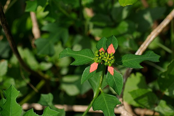 | 北アメリカ南部原産の一年草で、沖縄県では古くから原野に野生化している。高さは1メートルほどになる。葉は先の尖った長楕円状卵形で、不規則にくびれる。 花序に近い葉は赤く着色する。 杯状花序に花弁の無い小さな花を付ける。花期は9〜12月。 〜徒然想〜 クリスマスカードのデザインにこの植物を利用する方が多いようです。確かに、姿よく朱色に色付いた葉は、ポインセチアのようでクリスマスによく似合います。 クリスマスは、フランシスコ・ザビエルとともに伝来し、次第に日本でも習慣化していったようですが、もし、ショウジョウソウが渡ってきた時期と重なったら面白いことになりそうです。(そう、うまくはいかないでしょう!) −同じ科の植物− |