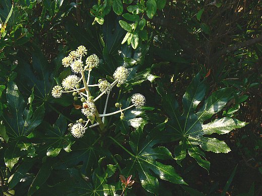 花は晩秋に咲き、球状の散形花序がさらに集まって大きな円錐花序を作ります。