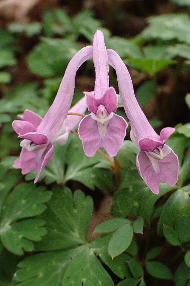 山野の林下などに生える多年草で、高さは10〜20センチ。葉は1〜3回3出複葉。小葉は卵円形〜披針形など変化が多い。 花は茎頂に少数又は多数つき、青紫色で長さ1.5〜2.5センチ。苞は歯牙又は欠刻がある。花期は4〜5月。本州〜九州に分布する。 〜徒然想〜 幅1メートルほどの一面には、若緑の葉がびっしり広がっています。その中にポツンポツンと紫色の花が立ち上がっています。まだ咲き始めなのでしょうが、全部が咲いたら、壮観な姿をみせてくれることでしょう。 苞の先がギザギザなのが特徴で、ジロボウエンゴサクと見分けることができます。 葉の形には変化があります。花の色も淡い色や赤みが強い色など、いろいろあります。 −同じ科の植物−